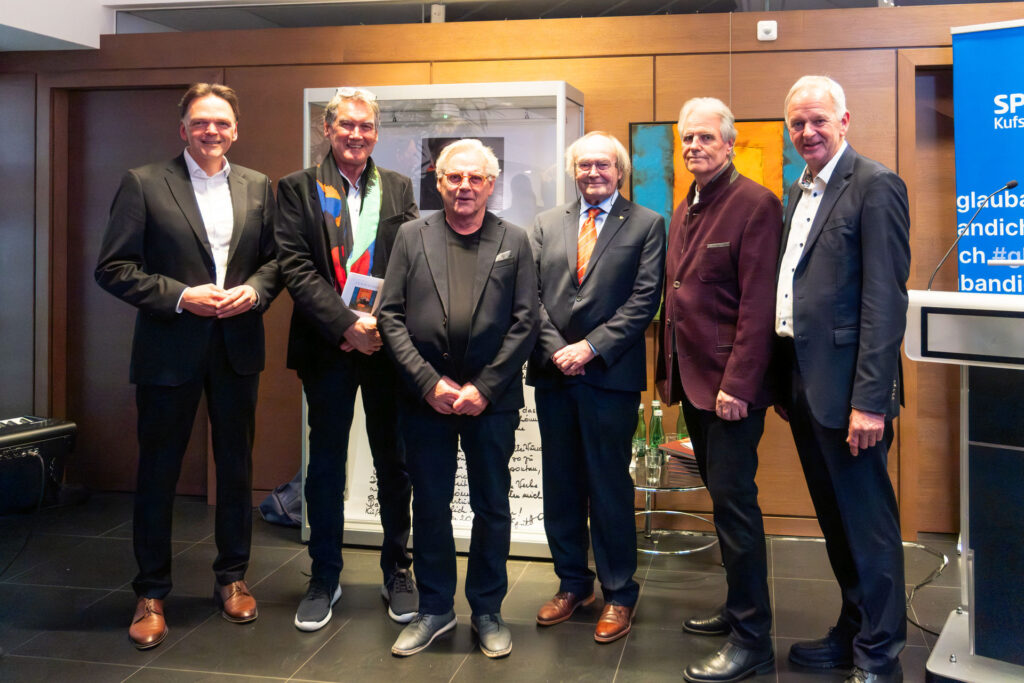 Gelungener Auftakt zur Ausstellung mit Bildern des Tiroler Künstlers Hans Seifert - v.l.nr.: Vorstandsdirektor Otto Dialer, Laudator Georg Schärmer, Maler Hans Seifert, Sparkassen-Präsident Siegfried Günther, Ausstellungskurator Hans-Peter Gruber und Vorstandsdirektor Klaus Felderer. Foto: Sparkasse Kufstein